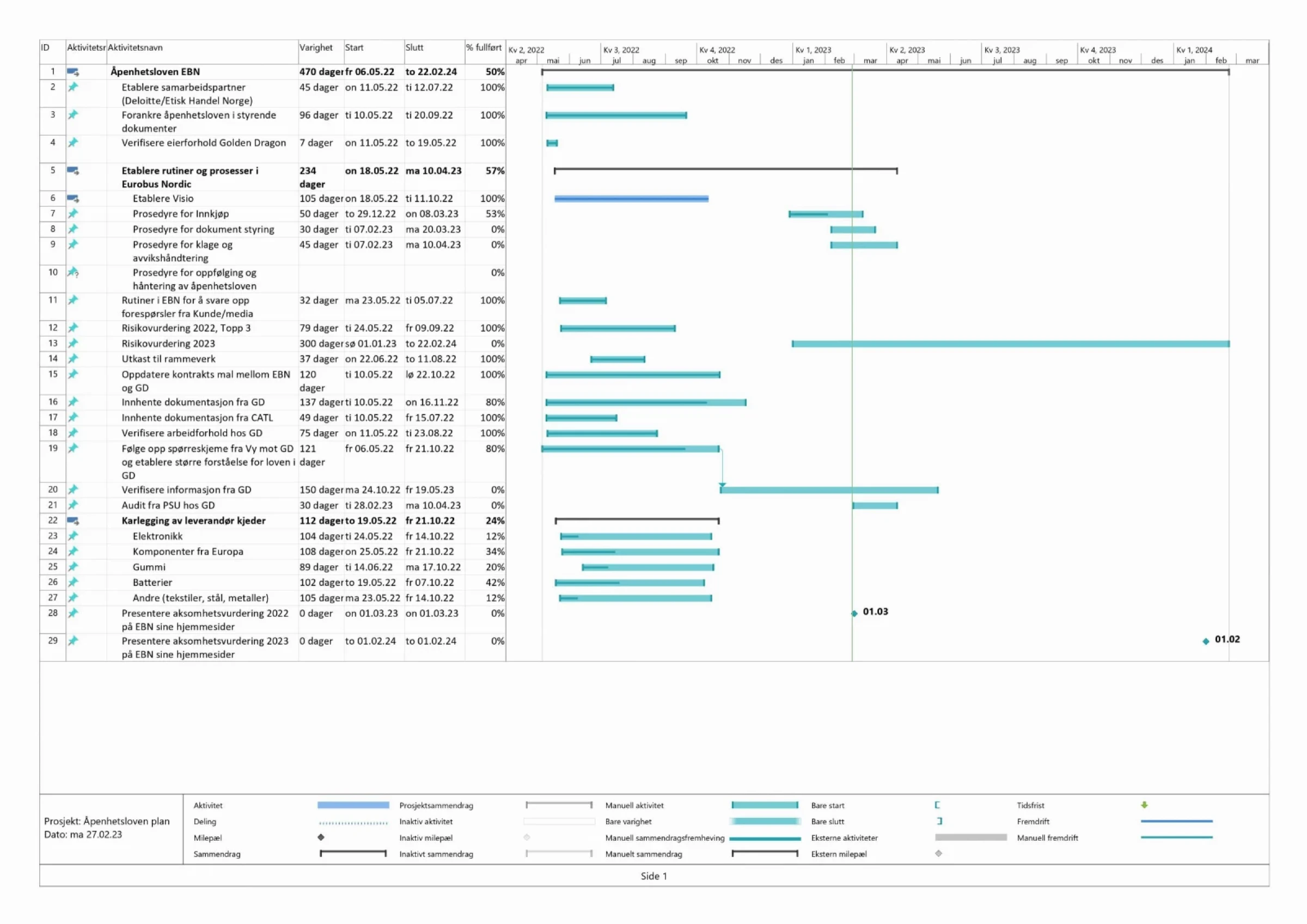Åpenhetsloven er bygget opp rundt proporsjonalitet og prioritering og har en risikobasert tilnærming. Eurobus Nordic AS derfor vedtatt følgende fremdrift og aktivitetsplan for implementeringsprosjektet.