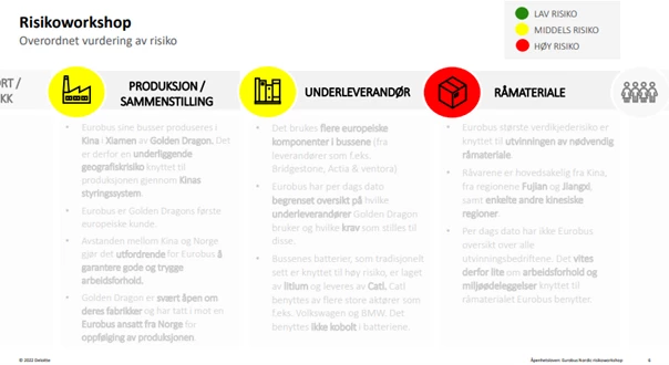 Aktsomhetsvurderingen ble tatt med utgangspunkt i konsekvens og sannsynlighet for brudd på menneskerettigheter og anstendige arbeidsforhold For å avgjøre hvilke prioriteringer Eurobus Nordic AS skulle gjøre gjennomførte vi en workshop for å kartlegge risikoen. Alle bussene som vi importerer produseres hos Golden Dragon. Det er derfor hos Golden Dragon og deres underleverandører som utgangspunktet for vår aktsomhetsvurdering.